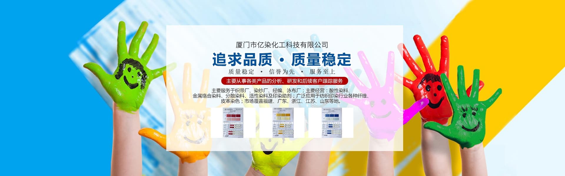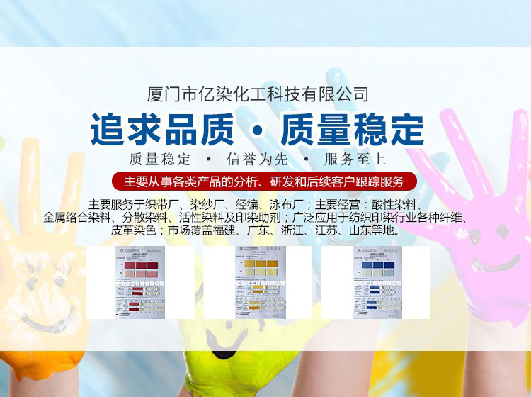 廈門(mén)市億染化工科技有限公司是一家集研發(fā)、生產(chǎn)、銷(xiāo)售一體的綜合型企業(yè)。公司主要經(jīng)營(yíng):酸性染料、金屬絡(luò)合染料、高牢度分散染料及印染助劑。公司信守“以誠(chéng)信贏合作、以質(zhì)量贏市場(chǎng)、以創(chuàng)新贏發(fā)展、以服務(wù)贏生存”的企業(yè)精神服務(wù)于廣大客戶(hù),多年以來(lái)建立了良好的市場(chǎng)口碑,市場(chǎng)遍布福建、廣東、浙江、江蘇、山東及東南亞國(guó)家,與多家知名企業(yè)建立了長(zhǎng)期合作伙伴關(guān)系!